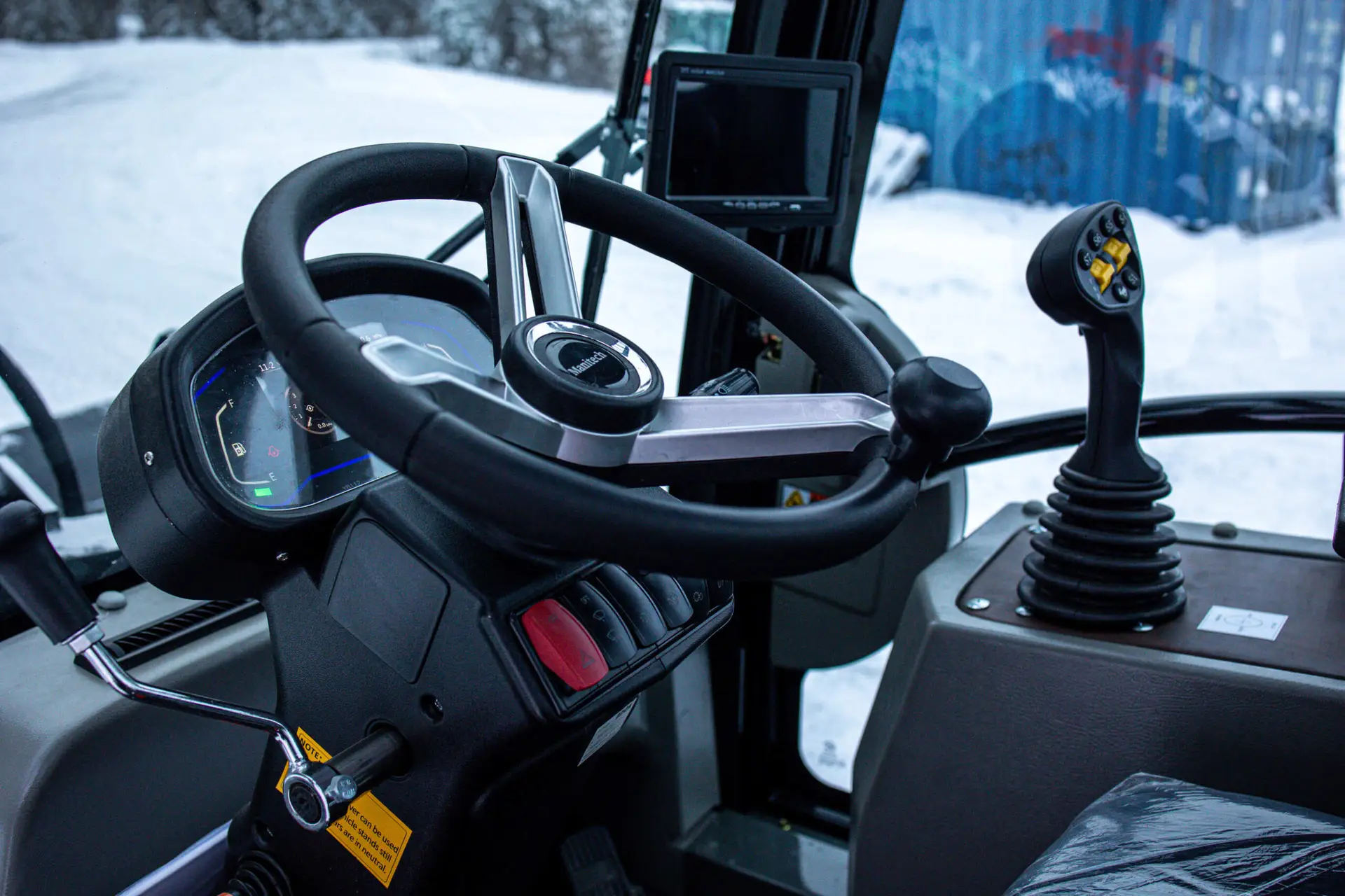 Designad med användaren i fokus erbjuder lastmaskinen bland annat elektrisk joystick för smidig styrning, hydrauliskt snabbfäste för enkla byten av redskap till din hjullastare. Med vår rymliga hytt har du backkamera för enkelt kunna se din omgivning och extra ljudisolering för maximal komfort.